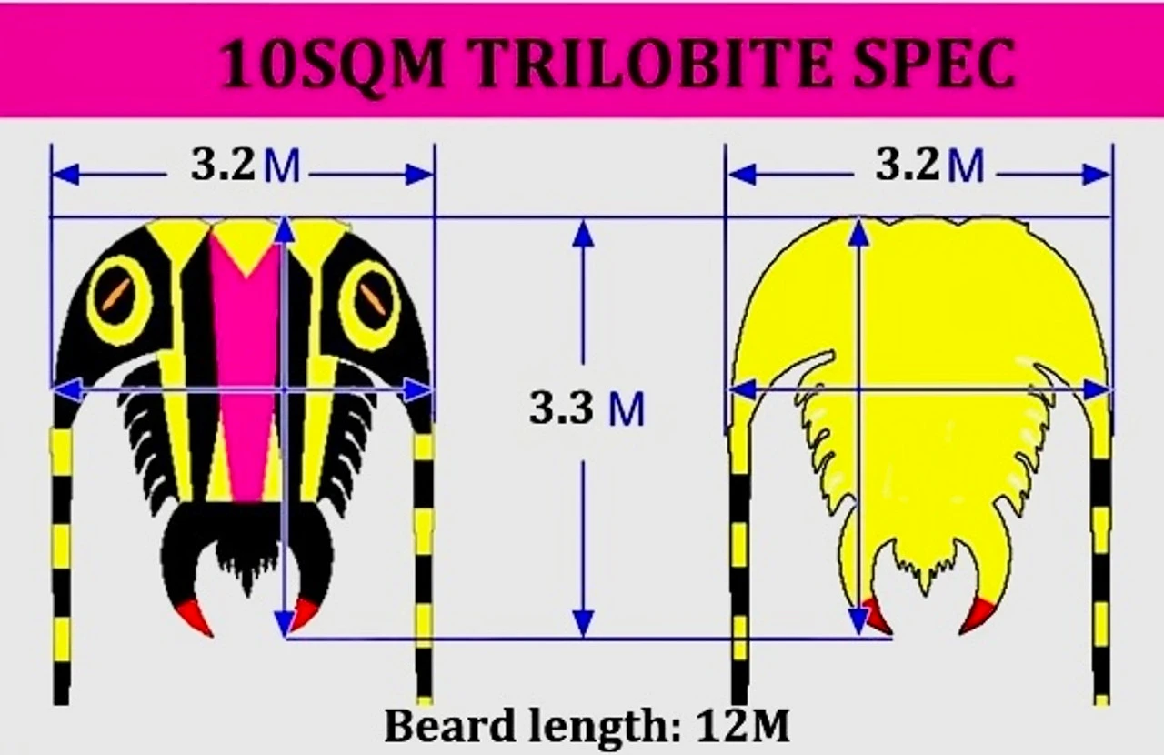 This Trilobite is a wonderful soft (inflatable) kite At 10m (10.5’W x 11′ tall with 39′ legs) it’s one enormous bug which flies remarkably well in a wind range of 8 to 18 mph. It can also be hung on a kite-line to fly as line laundry, but probably makes a bigger impact flying on its own Packs away quite small for transport, and no assembly needed, so it can be into the air very quickly. A great addition to anyone’s collection.