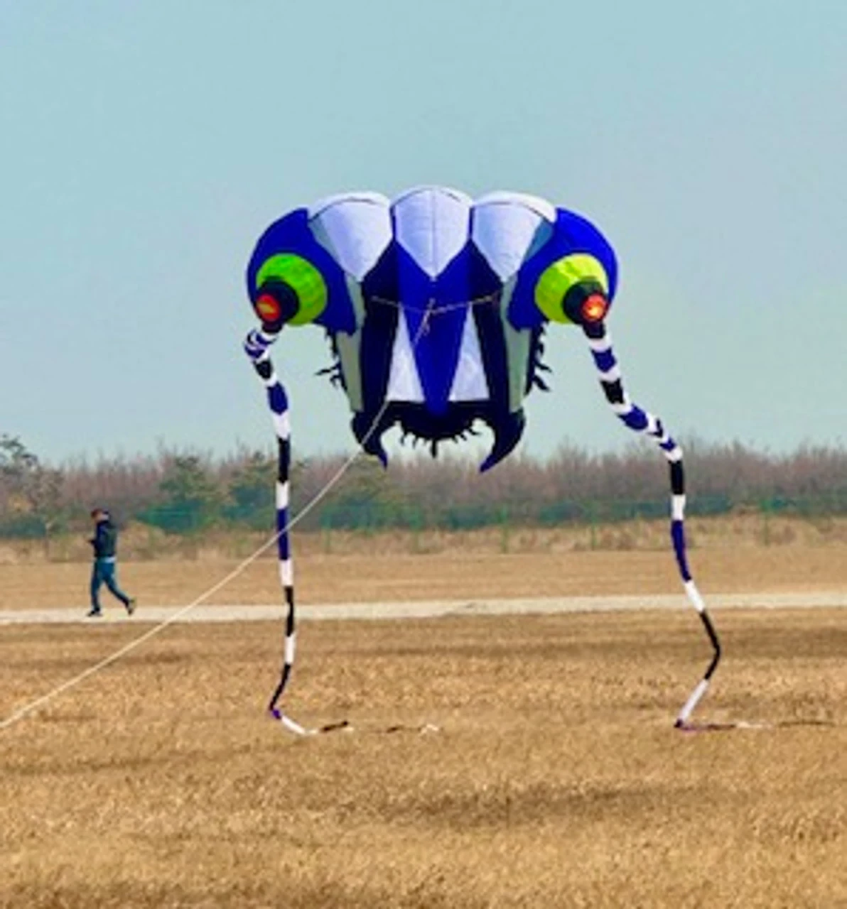 This Trilobite is a wonderful soft (inflatable) kite At 2m (4.5′ x 5′ tall with 19.5 Ft legs) it’s one enormous bug which flies remarkably well in a wind range of 8 to 18 mph. It can also be hung on a kite-line to fly as line laundry, but probably makes a bigger impact flying on its own Packs away quite small for transport, and no assembly needed, so it can be into the air very quickly. A great addition to anyone’s collection.